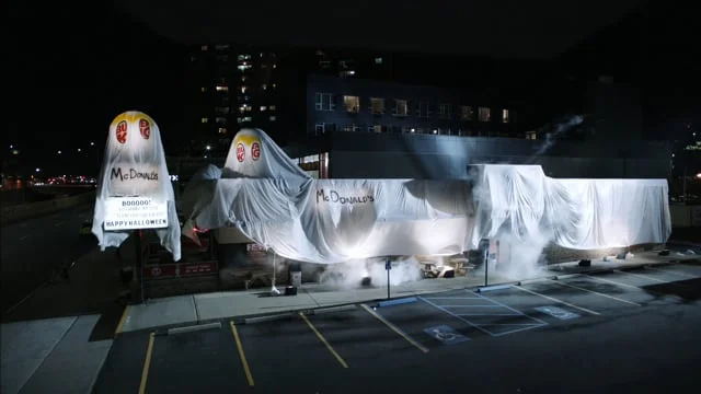 I worked as a set dresser with RND Studios. We had to create a 10,000 sq. ft custom super silk slip cover and then cover an entire Burger King with it. It took 12 crew members working overnight to install it, but the finished product was well worth it.